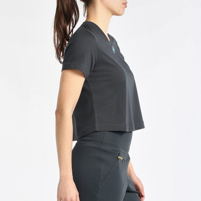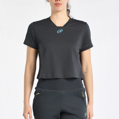 Camiseta de manga corta, corte cropped y cuello de pico. Corte en el pecho donde termina el cuello. Logotipo de Bullpadel en el pecho y de Bea en la espalda. Tejido con acabado Quickerdry, que facilita la evacuación del sudor.