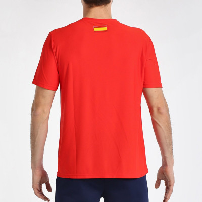 Maglietta girocollo a maniche corte della Federazione Spagnola, in tessuto ottoman di poliestere, con parte anteriore sublimata. Indumento con il carattere che ci caratterizza in campo. Leggero, comodo e bello. Viene applicata la finitura Quickerdry, una tecnologia che utilizza microfilamenti per ridurre l'umidità e favorire la traspirazione.